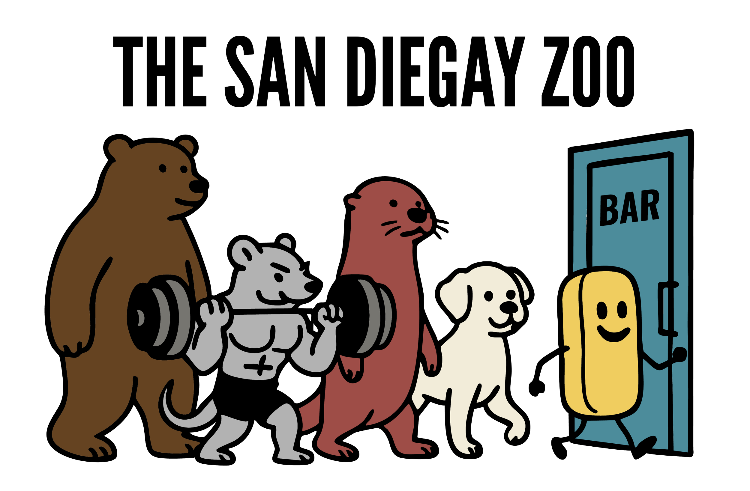 Step right up and witness nature’s finest: a bear, an otter, a pup, a gym shark, and a literal walking Twinkie all strutting into a bar. “San Diegay Zoo” is a cheeky roll call of the gay animal kingdom—part nightlife, part National Geographic, all fabulous. Whether you’re covered in fur, protein powder, or buttercream, this graphic celebrates every species under the disco ball. Don’t feed the animals... unless they ask nicely.
