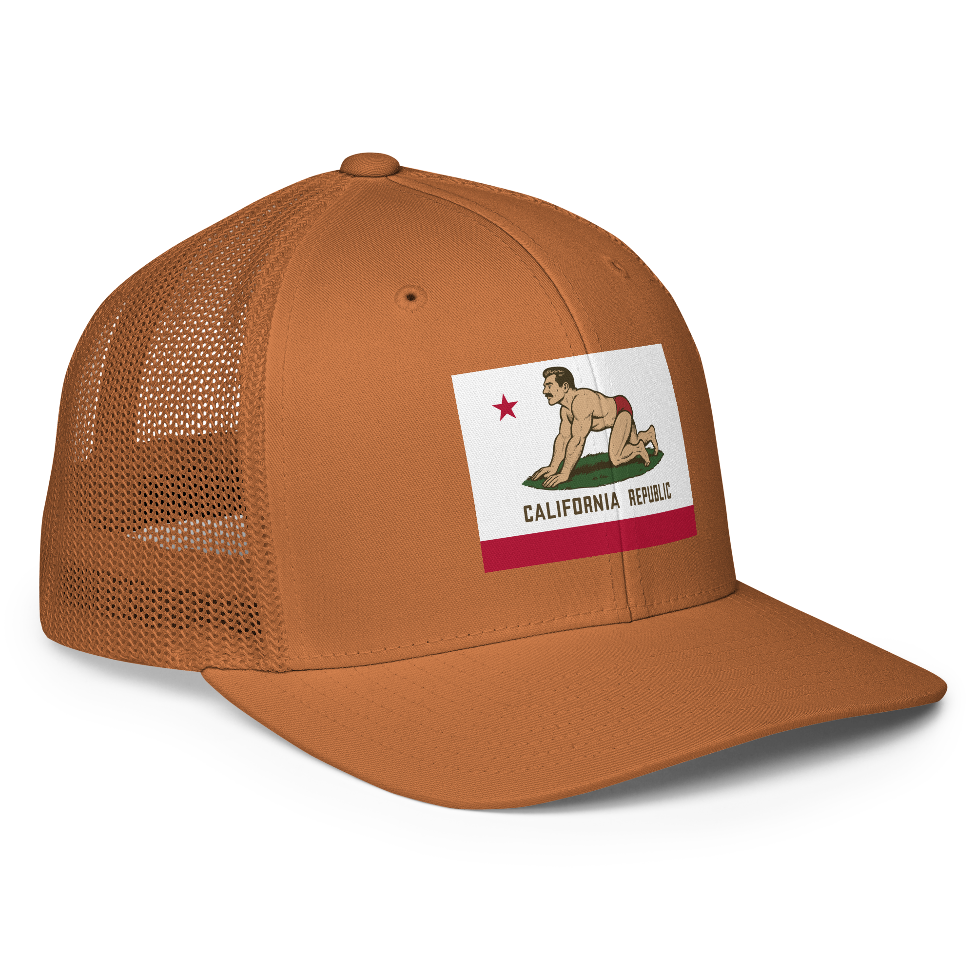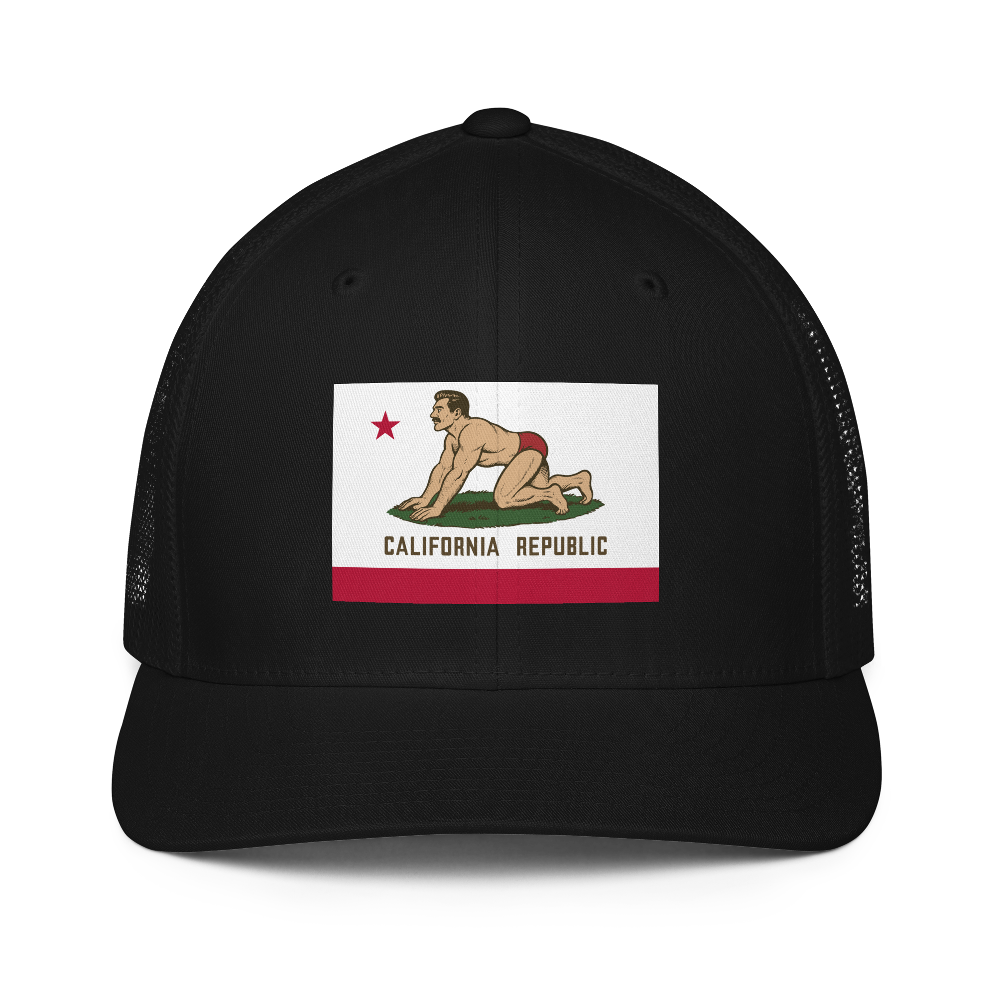 CA Bear Flag (Barry) Flexfit Trucker Hat — White Graphic